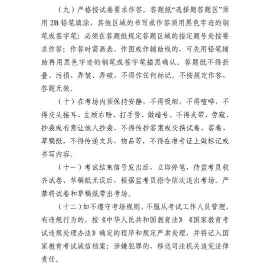 考生須嚴格遵守有關(guān)法律、法規(guī)和考試有關(guān)規(guī)定,誠信考試。如有違規(guī)行為,一經(jīng)查實,將根據(jù)《國家教育考試違規(guī)處理辦法》(教育部令第33號)等規(guī)定嚴肅處理,并記入國家教育考試誠信檔案。有組織作弊、提供作弊器材或者其他幫助的;向他人非法出售或者提供考試試題及答案的;代替他人或者讓他人代替自己參加考試等行為的,將根據(jù)《中華人民共和國刑法》規(guī)定追究相關(guān)人員法律責任。