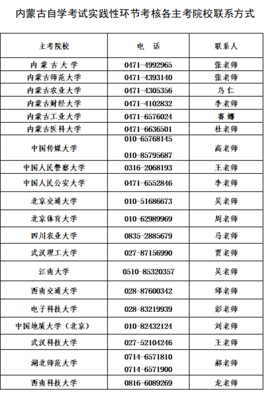 附件2:內(nèi)蒙古自學(xué)考試實踐性環(huán)節(jié)考核各主考院校聯(lián)系方式